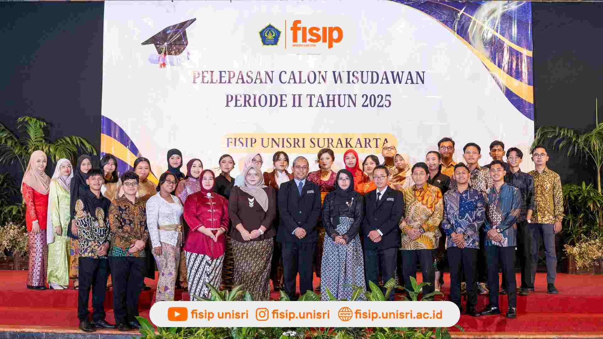 Fakultas Ilmu Sosial dan Ilmu Politik (FISIP) Universitas Slamet Riyadi (UNISRI) Surakarta menggelar Pelepasan Calon Wisudawan Periode II Tahun 2025 pada Selasa malam (28/10) di Grha Saba Buana, Surakarta. Acara berlangsung penuh kehangatan dan rasa syukur, dihadiri oleh dosen, tenaga kependidikan, mahasiswa, serta keluarga calon wisudawan.